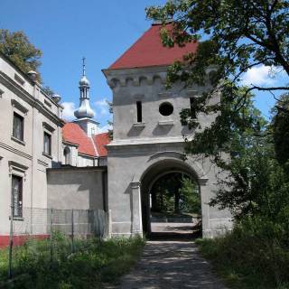 Zespół podworski z XIX w. z przebudowanym dworem i basztą o charakterze romantycznym