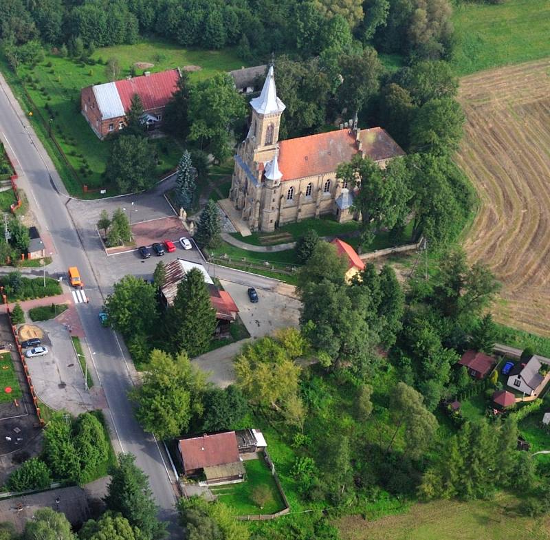 wzmiankowany był w 1415 r. Obecny kościół pw. Piotra i Pawła wraz z kostnicą i
