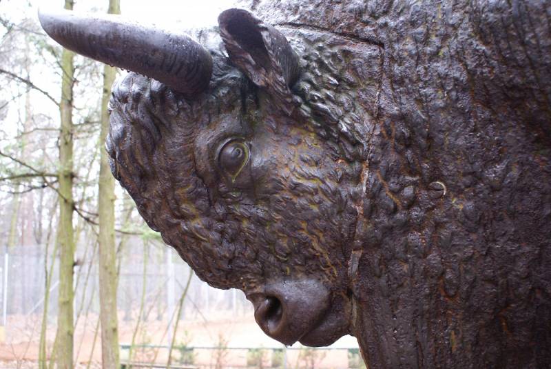 Historia żeliwnego posągu, powszechnie uznawanego za nieoficjalny herb Spały, zaczyna się od carskiego polowania, które odbyło się w październiku 1860 r. w Puszczy Białowieskiej. Dla upamiętnienia tego wydarzenia car Aleksander II polecił ustawić na miejscu łowów posąg żubra naturalnej wielkości. Pomnik stanowił atrakcję Zwierzyńca w pobliżu Białowieży. Zawirowania wojenne sprawiły, że został wywieziony do Moskwy, następnie przywieziony do Polski i usytuowany w Warszawie. W 1928 r. na polecenie Prezydenta RP Ignacego Mościckiego posąg żubra sprowadzono do Spały.