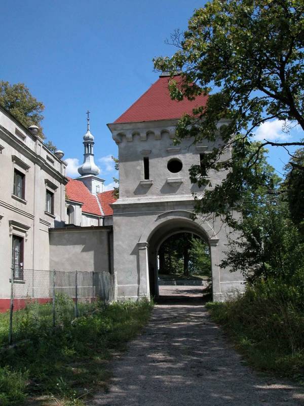 Zespół podworski z XIX w. z przebudowanym dworem i basztą o charakterze romantycznym