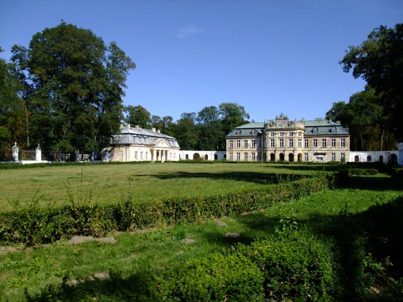 Dziedziniec otacza klasycystyczne ogrodzenie, a cały zespół pałacowy ogromny park, który od północy opada stromo do Pilicy, od południa ma charakter geometryczny z czterema kwaterami oraz alejami lipowymi, a od wschodu - krajobrazowy.