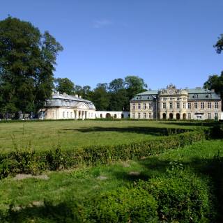 Klasycystyczny główny korpus jednopiętrowego pałacu, zaprojektowany przez Ferdynanda Naxa, zamyka wschodnią oś dziedzińca.